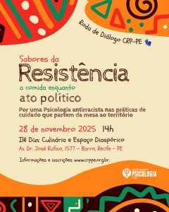 O Conselho Regional de Psicologia de Pernambuco - 2ª Região (CRP-PE) convida psicólogas e estudantes para celebrar o mês da Consciência Negra com a realização da Roda de Diálogos “Sabores da Resistência”. O encontro, organizado por meio da Comissão de Relações Étnico-Raciais, está marcado para o dia 28 de novembro, a partir das 14h, no Ilê Dùn: Culinária e Espaço Diaspórico, localizado na Av. Dr. José Rufino, 1577 - Barro, Recife – PE.