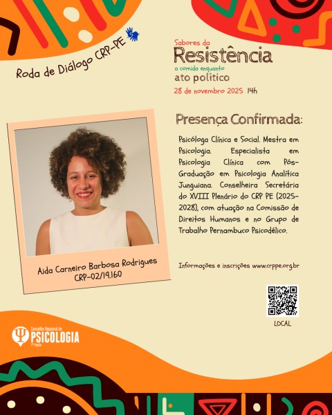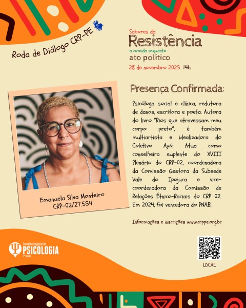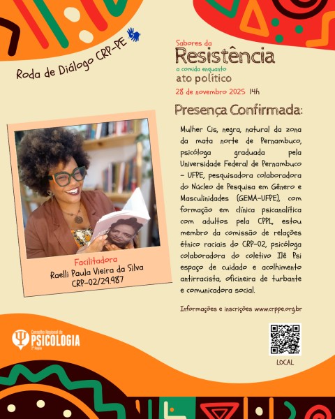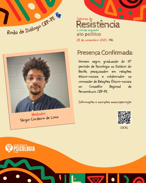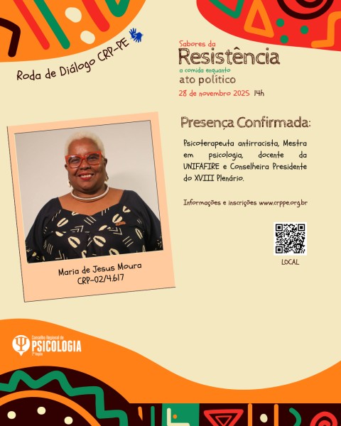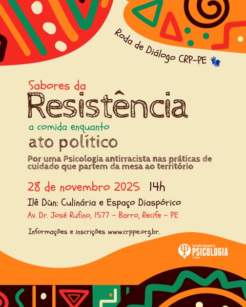 O Conselho Regional de Psicologia de Pernambuco - 2ª Região (CRP-PE) convida psicólogas e estudantes para celebrar o mês da Consciência Negra com a realização da Roda de Diálogos “Sabores da Resistência”. O encontro, organizado por meio da Comissão de Relações Étnico-Raciais, está marcado para o dia 28 de novembro, a partir das 14h, no Ilê Dùn: Culinária e Espaço Diaspórico, localizado na Av. Dr. José Rufino, 1577 - Barro, Recife – PE.