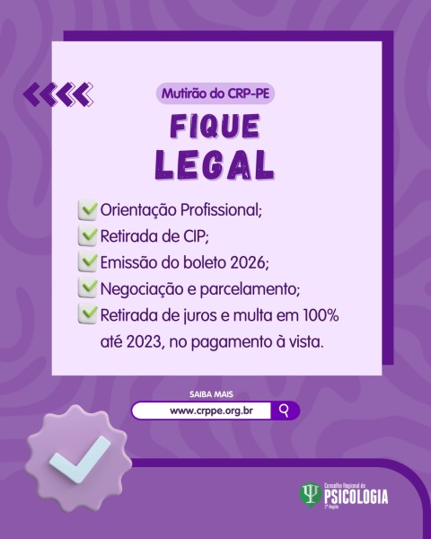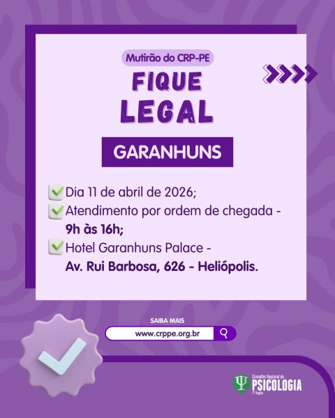 O Conselho Regional de Psicologia de Pernambuco – 2ª Região (CRP-PE) segue realizando os Mutirões da Campanha Fique Legal no interior do estado, com o objetivo de intensificar os serviços orientativos, administrativos e financeiros em diversas cidades. Agora, a iniciativa será realizada em Garanhuns, no dia 11 de abril, no Hotel Garanhuns Palace (Av. Rui Barbosa, 626 - Heliópolis, Garanhuns – PE). Os atendimentos acontecerão por ordem de chegada, das 9h às 16h.