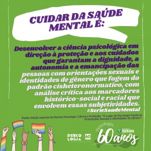 A série "Cuidar da Saúde Mental é", de junho é dedicada ao Mês do do Orgulho LGBTI+ . Destacamos um trecho do texto que compõe a edição especial da Revista Psicologia: Ciência e Profissão, que tem como título: O Lugar da Psicologia Frente às Orientações Sexuais e Identidades de Gênero.
