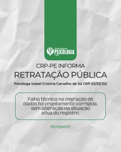 O Conselho Regional de Psicologia de Pernambuco – 2ª Região (CRP-PE) informa que houve um erro na transição de dados entre plataformas no cadastro da psicóloga Izabel Cristina Carvalho de Sá (CRP-02/23132). Corrigimos o erro de imediato, assim que tomamos conhecimento. Ratificamos que o seu cadastro se manteve ativo e regular desde a sua inscrição, realizada em 11 de fevereiro de 2020, até a presente data.
