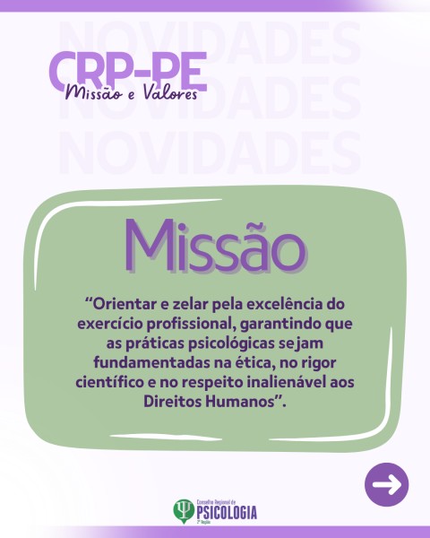 A nova Missão do Conselho passa a ser: “orientar e zelar pela excelência do exercício profissional, garantindo que as práticas psicológicas sejam fundamentadas na ética, no rigor científico e no respeito inalienável aos Direitos Humanos”. O texto reafirma a responsabilidade legal e social quanto a fiscalização e orientação das psicólogas, consolidando o compromisso com práticas qualificadas e socialmente responsáveis.