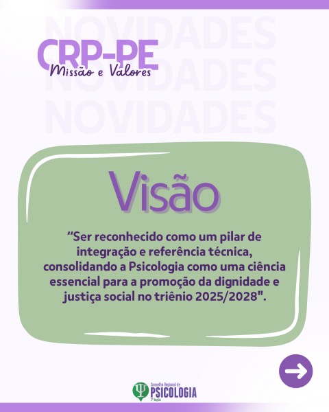 Em complemento, a Visão projeta o CRP-PE a fim de “ser reconhecido como um pilar de integração e referência técnica, consolidando a psicologia como uma ciência essencial para a promoção da dignidade e justiça social no triênio 2025/2028”. A perspectiva reforça o papel estratégico do Conselho como articulador da categoria e agente de valorização da Psicologia enquanto ciência e profissão indispensável.