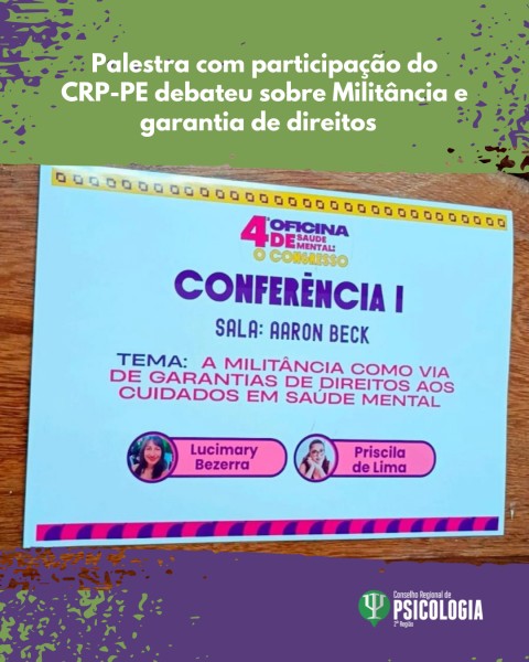 Entre os dias 11, 12 e 13 de setembro, aconteceu a 4ª Oficina de Saúde Mental: O Congresso, na cidade de Petrolina (PE). O Conselho Regional de Psicologia de Pernambuco - 2ª Região (CRP-PE) teve a oportunidade de estar presente durante a conferência de abertura, com diálogos acerca da temática “Militância como via de garantia de direitos em saúde mental”.